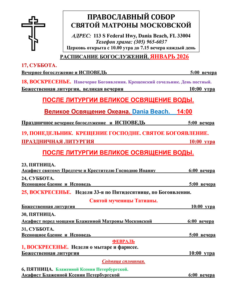 22 ноября, в день памяти святой блаженной Матроны Московской, храмовый праздник отмечает Майамский собор, посвященный этой угоднице Божией. В этом году приход отмечает 14 лет открытия нового храма и 10 лет его освящения.
